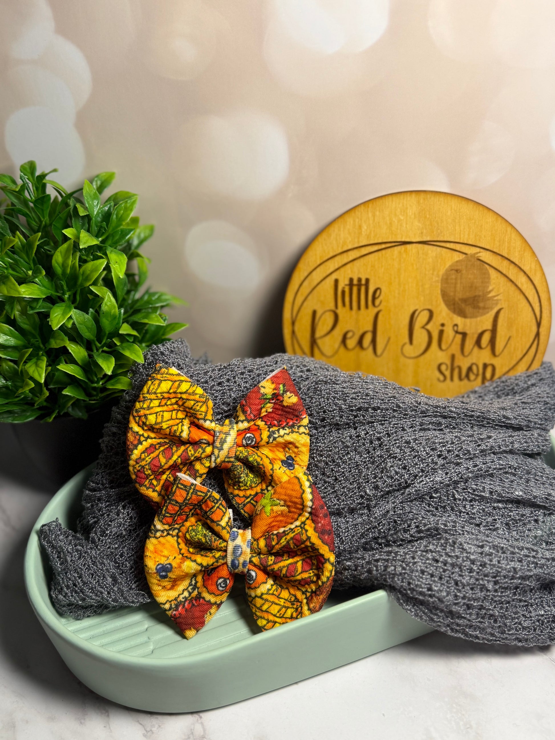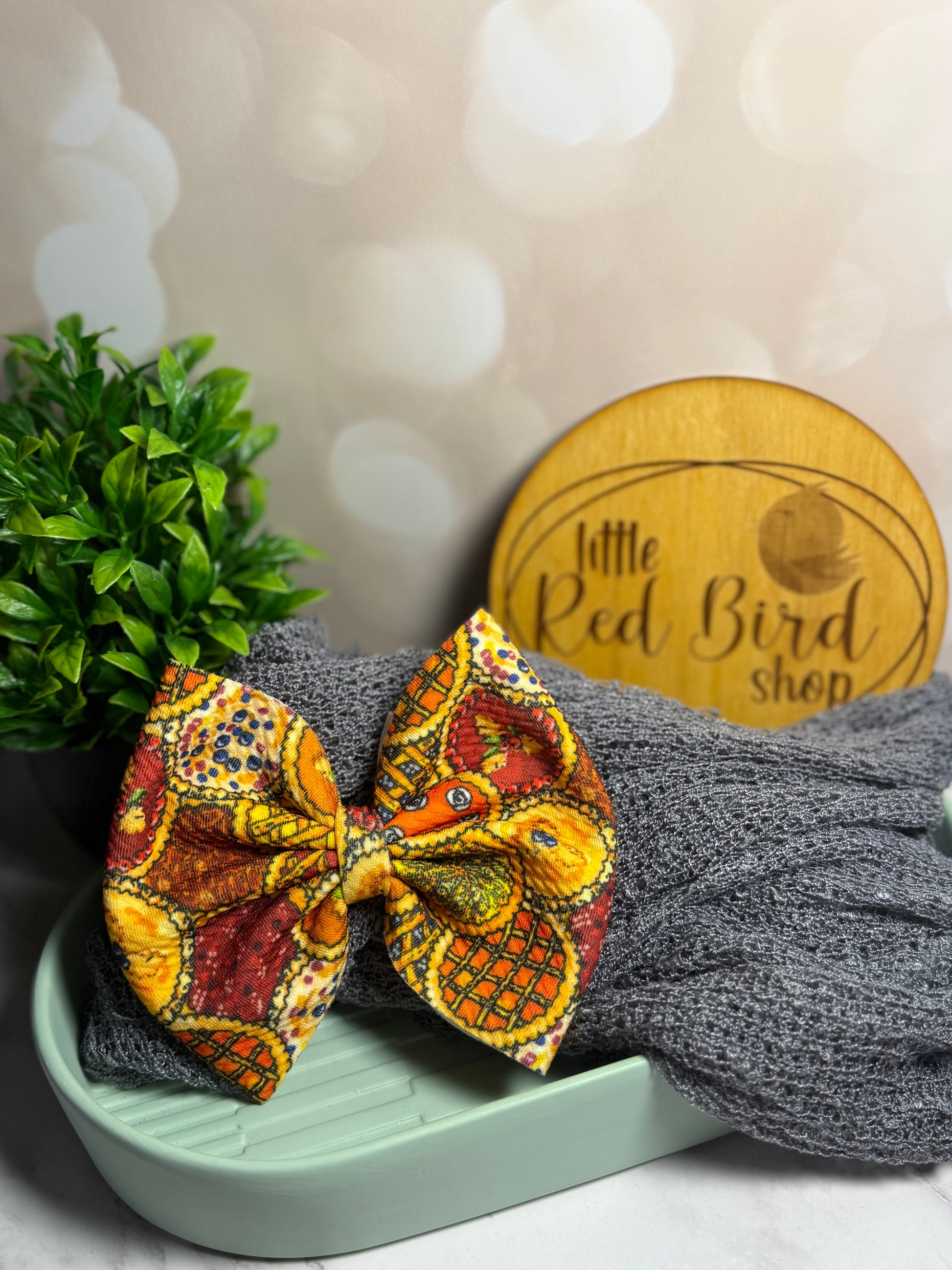 Bows come finished on a 3inch clip or nylon. Piggies come permanently finished with a 1.75inch clip or available on nylon if noted. Headwraps are 5-inch bows, hand tied. Please take note, products are handmade and may show minor imperfections. Colors and shades may be slightly than they appear. Accessories are hazards! Never leave your child unattended while wearing any kind of accessory.